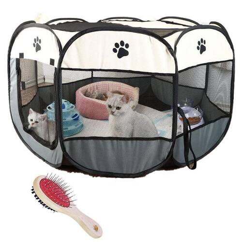 Cercado Extra Grande Cão Gato Pet Portátil Cinza + Escova Cercadinho Portátil para Animais de Estimação - Espaço Seguro e Confortável em Qualquer Lugar