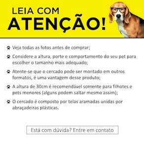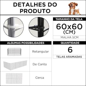 CERCADO CACHORRO ARTICULADO MÓVEL PET 6 TELAS ARAMADAS 60CM DE ALTURA ROSE * 6 TELAS, VÁRIAS POSSIBILIDADESEste tipo de cercado é montado com telas aramadas e abraçadeiras de nylon, o que o torna um produto versátil para ser montado conforme a sua necessidade, além da possibilidade de simplesmente guardá-lo montado de uma forma que ocupe menos espaço.Serve para animais de pequeno e médio porte ou filhotes como de cachorro e gato. Também é apropriado para coelho, porquinho da índia entre outros pets, com a devida atenção se atravessam ou não a malha da grade.Existe a possibilidade de usar as telas como cerca e portão com as devidas precauções e adaptações por conta do cliente.RECOMENDAÇÕES DE USO:- Filhotes de cachorros e gatos;- Cachorros de pequeno e médio porte;- Porquinhos da Índia, mini coelhos e coelhos.* Recomendamos que sempre verifique antes da escolha se o seu PET não atravessa a malha das telas (buracos) e/ou se ele não salta pelo cercado.DIMENSÕES APROXIMADAS/ POSSIBILIDADES: - Cercado Retangular: 60x120x60cm - Cercado Hexágono: 60cm cada lado - Cerca Linha Reta: 60x360cm (3,6 metros) - Cerca Larga: 120x180cm (1,8 metro)CARACTERÍSTICAS: - Cor: Rose - Acabamento em pintura eletrostática - Material Tela: Aço - Material Abraçadeira: Nylon - Telas: 60x60cm - Malha: 5cmRECOMENDAÇÃO - Clips auto adesivos servem para ajudar na imobilização do cercado e dispensam furação; - Parafuso gancho ajuda a imobilizar de forma mais firme, pois precisam furar a parede ou chão para colocá-los; - Conectivos ajudam na montagem de um cercado fixo (conectivos são removíveis quando precisar)* Possuímos os mais variados tipos de cercados em modelos e tamanhosITENS INCLUSOS:- 6 telas 60x60cm e abraçadeiras de nylon para montagem de um cercado móvel* Procurou um modelo e não encontrou? Tem algum projeto específico? Não sabe como aumentar seu cercado? Deixe-nos saber e vamos te ajudar!OBSERVAÇÕES: - Garantia de 3 meses contra defeitos de fabricação - O produto vai desmontado para ser montado no local - Imagens ilustrativas e com sugestões de montagem - Não nos responsabilizamos pelo uso inadequado do produtoNão deixe de conhecer nossos outros produtos! Marca: IGUANNA