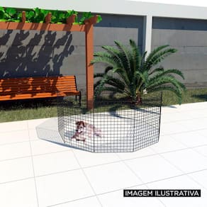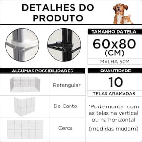 CERCADO CACHORRO ARTICULADO MÓVEL PET 10 TELAS ARAMADAS 60x80 PRETO * 10 TELAS, VÁRIAS POSSIBILIDADESEste tipo de cercado é montado com telas aramadas e abraçadeiras de nylon, o que o torna um produto versátil para ser montado conforme a sua necessidade, além da possibilidade de simplesmente guardá-lo montado de uma forma que ocupe menos espaço.Serve para animais de pequeno e médio porte ou filhotes como de cachorro e gato. Também é apropriado para coelho, porquinho da índia entre outros pets, com a devida atenção se atravessam ou não a malha da grade.Existe a possibilidade de usar as telas como cerca e portão com as devidas precauções e adaptações por conta do cliente.RECOMENDAÇÕES DE USO:- Filhotes de cachorros e gatos;- Cachorros de pequeno e médio porte;- Porquinhos da Índia, mini coelhos e coelhos.* Recomendamos que sempre verifique antes da escolha se o seu PET não atravessa a malha das telas (buracos) e/ou se ele não salta pelo cercado.DIMENSÕES APROXIMADAS/ POSSIBILIDADES: - Cercado Retangular 1ª Opção: 180x120X80cm - Cercado Retangular 2ª Opção: 240x160x60cm - Cerca Linha Reta 1ª Opção: 80x600cm (6 metros) - Cerca Linha Reta 2ª Opção: 60x800cm (8 metros)CARACTERÍSTICAS: - Cor: Preto - Acabamento em pintura eletrostática - Material Tela: Aço - Material Abraçadeira: Nylon - Telas: 60x80cm - Malha: 5cmRECOMENDAÇÃO - Clips auto adesivos servem para ajudar na imobilização do cercado e dispensam furação; - Parafuso gancho ajuda a imobilizar de forma mais firme, pois precisam furar a parede ou chão para colocá-los; - Conectivos ajudam na montagem de um cercado fixo (conectivos são removíveis quando precisar)* Possuímos os mais variados tipos de cercados em modelos e tamanhosITENS INCLUSOS:- 10 telas 60x80cm e abraçadeiras de nylon para montagem de um cercado móvel* Procurou um modelo e não encontrou? Tem algum projeto específico? Não sabe como aumentar seu cercado? Deixe-nos saber e vamos te ajudar!OBSERVAÇÕES: - Garantia de 3 meses contra defeitos de fabricação - O produto vai desmontado para ser montado no local - Imagens ilustrativas e com sugestões de montagem - Não nos responsabilizamos pelo uso inadequado do produtoNão deixe de conhecer nossos outros produtos! Marca: IGUANNA