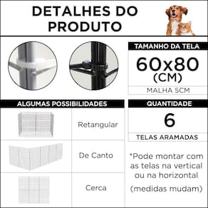 CERCADO CACHORRO ARTICULADO MÓVEL PET 6 TELAS ARAMADAS 60x80 BRANCO * 6 TELAS, VÁRIAS POSSIBILIDADESEste tipo de cercado é montado com telas aramadas e abraçadeiras de nylon, o que o torna um produto versátil para ser montado conforme a sua necessidade, além da possibilidade de simplesmente guardá-lo montado de uma forma que ocupe menos espaço.Serve para animais de pequeno e médio porte ou filhotes como de cachorro e gato. Também é apropriado para coelho, porquinho da índia entre outros pets, com a devida atenção se atravessam ou não a malha da grade.Existe a possibilidade de usar as telas como cerca e portão com as devidas precauções e adaptações por conta do cliente.RECOMENDAÇÕES DE USO:- Filhotes de cachorros e gatos;- Cachorros de pequeno e médio porte;- Porquinhos da Índia, mini coelhos e coelhos.* Recomendamos que sempre verifique antes da escolha se o seu PET não atravessa a malha das telas (buracos) e/ou se ele não salta pelo cercado.DIMENSÕES APROXIMADAS/ POSSIBILIDADES: - Cercado Retangular 1ª Opção: 120x60X80cm - Cercado Retangular 2ª Opção: 160x80x60cm - Cerca Linha Reta 1ª Opção: 80x360cm (3,6 metros) - Cerca Linha Reta 2ª Opção: 60x480cm (4,8 metros)CARACTERÍSTICAS: - Cor: Branco - Acabamento em pintura eletrostática - Material Tela: Aço - Material Abraçadeira: Nylon - Telas: 60x80cm - Malha: 5cmRECOMENDAÇÃO - Clips auto adesivos servem para ajudar na imobilização do cercado e dispensam furação; - Parafuso gancho ajuda a imobilizar de forma mais firme, pois precisam furar a parede ou chão para colocá-los; - Conectivos ajudam na montagem de um cercado fixo (conectivos são removíveis quando precisar)* Possuímos os mais variados tipos de cercados em modelos e tamanhosITENS INCLUSOS:- 6 telas 60x80cm e abraçadeiras de nylon para montagem de um cercado móvel* Procurou um modelo e não encontrou? Tem algum projeto específico? Não sabe como aumentar seu cercado? Deixe-nos saber e vamos te ajudar!OBSERVAÇÕES: - Garantia de 3 meses contra defeitos de fabricação - O produto vai desmontado para ser montado no local - Imagens ilustrativas e com sugestões de montagem - Não nos responsabilizamos pelo uso inadequado do produtoNão deixe de conhecer nossos outros produtos! Marca: IGUANNA