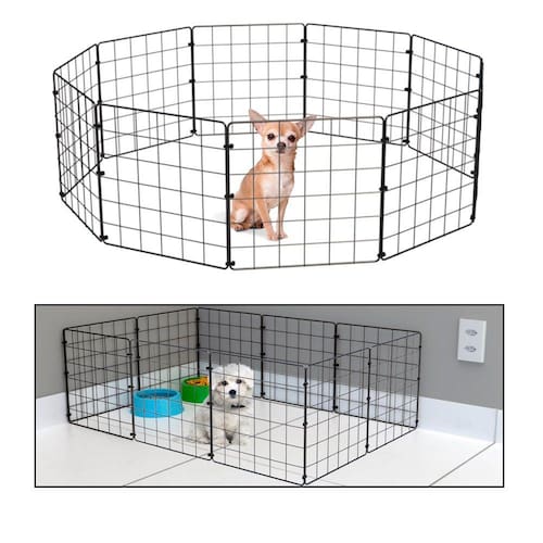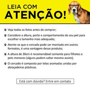 CERCADINHO MÓVEL PARA CACHORRO GATO PEQUENO PORTE PORQUINHO DA ÍNDIA COM TELA ARAMADA 30CM DE ALTURA* 10 TELAS, VÁRIAS POSSIBILIDADESEste tipo de cercado é montado com telas aramadas e abraçadeiras de nylon, o que o torna um produto versátil para ser montado conforme a sua necessidade, além da possibilidade de simplesmente guardá-lo montado de uma forma que ocupe menos espaço.Serve para animais de pequeno porte ou filhotes como de cachorro e gato. Também é apropriado para porquinho da índia entre outros pets, com a devida atenção se atravessam ou não a malha da grade.Existe a possibilidade de usar as telas aramadas como cerca e portão com as devidas precauções e adaptações por conta do cliente.RECOMENDAÇÕES DE USO:- Filhotes de cachorros e gatos;- Cachorros de pequeno porte;- Porquinhos da Índia.* Recomendamos que sempre verifique antes da escolha se o seu PET não atravessa a malha das telas (buracos) e/ou se ele não salta pelo cercado.DIMENSÕES APROXIMADAS/ POSSIBILIDADES: - Cercado Retangular 1ª Opção: 30x120cm - Cercado Retangular 2ª Opção: 60x90 cm - Cercado Decágono: 30cm cada lado - Cerca Linha Reta: 300cm (3 metros) - Cerca Larga: 60x150cmCARACTERÍSTICAS: - Cor: Preto - Material Tela: Aço - Acabamento em Pintura Eletrostática - Material Abraçadeira: Nylon - Telas: 30x30cm - Malha: 5cmRECOMENDAÇÃO - Clips auto adesivos servem para ajudar na imobilização do cercado e dispensam furação; - Parafuso gancho ajuda a imobilizar de forma mais firme, pois precisam furar a parede/ou chão para colocá-los; - Conectivos ajudam na montagem de um cercado fixo (conectivos são removíveis quando precisar)* Possuímos os mais variados tipos de cercados em modelos e tamanhosITENS INCLUSOS:- 10 telas 30x30cm e abraçadeiras de nylon para montagem de um cercado móvel* Procurou um modelo e não encontrou? Tem algum projeto específico? Não sabe como aumentar seu cercado? Deixe-nos saber e vamos te ajudar!OBSERVAÇÕES: - Garantia de 3 meses contra defeitos de fabricação - O produto vai desmontado para ser montado no local - Imagens ilustrativas e com sugestões de montagem - Não nos responsabilizamos pelo uso inadequado do produtoNão deixe de conhecer nossos outros produtos! Marca: IGUANNA