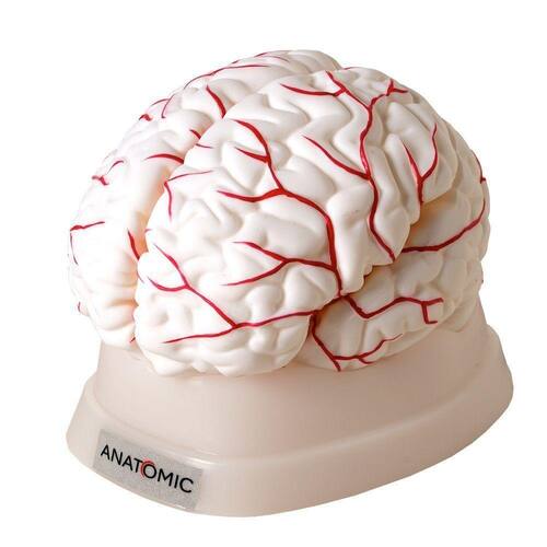 Modelo anatômico do cérebro desenvolvido para estudo e demonstração, evidencia sistema vascular arterial na região anterior, média e posterior, giros e sulcos cerebrais. Desmontável em até 8 partes, montado sobre base. Confeccionado em resina plástica emborrachada.
