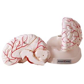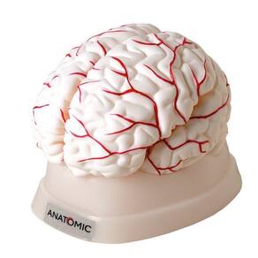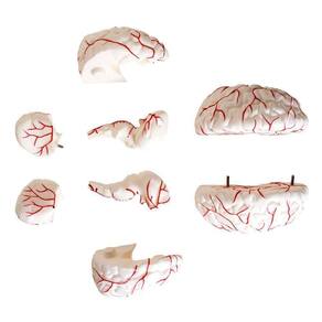 Modelo apresenta estruturas anatômicas do cérebro com vasos sanguíneos, giros e sulcos cerebrais, divididos em 8 partes. Confeccionado em resina plástica emborrachada.