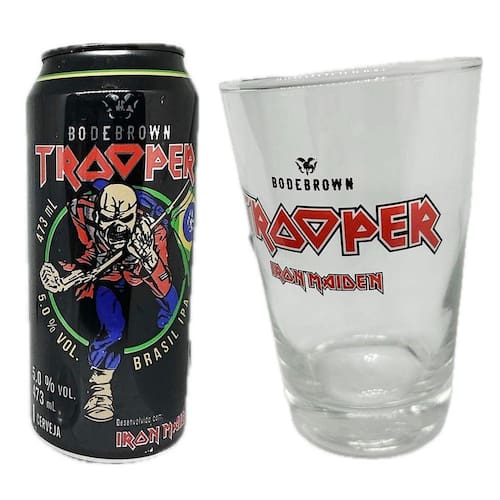 Cerveja Trooper Iron Maiden Ipa 473ml + Copo Trooper 350ml Desenvolvida pelo vocalista da banda Iron Maiden juntamente com a cervejaria Bodebrown. Inspirada em uma canção, a Trooper foi eleita a melhor cerveja em 2023 pelo seu suave sabor de cacau, chocolate branco e manga.