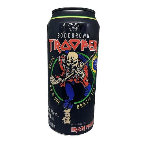 Cerveja Trooper Iron Maiden Ipa Bodebrown lata 473ml Desenvolvida pelo vocalista da banda Iron Maiden juntamente com a cervejaria Bodebrown. Inspirada em uma canção, a Trooper foi eleita a melhor cerveja em 2023 pelo seu suave sabor de cacau, chocolate branco e manga.