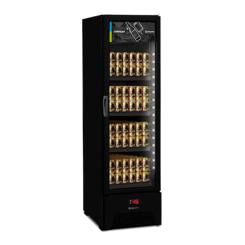 Cervejeira Metalfrio 324L All Balck 1 Porta Preta 220V VN28AHTecnologia avançada que se equipara a grandes marcas de cervejeiras no Brasil todo, a cervejeira Metalfrio VN28AH entrega suas bebidas na temperatura ideal, com a assinatura do maior produtor de cervejeiras do mundo. Com capacidade de 324 litros, a VN28AH é capaz de armazenar mais de 150 garrafas de 355ml. Conta com fluxo de ar continuo garantindo resfriamento rápido e uniforme das bebidas. Possui controlador eletrônico que atua diretamente na recuperação da temperatura em caso de aberturas seguidas da porta. Temperatura constante e baixo consumo de energia. A cervejeira VN28AH alia alta performance e ampla capacidade que garantem ao usuário uma experiência 100% Metalfrio. O controlador manual e interativo com 3 faixas de temperatura, que permite versatilidade e opções de escolha de acordo com a necessidade do seu negócio. Especificações Técnicas:- Marca: Metalfrio- Modelo: VN28AH- Voltagem: 220V - Tipo: Cervejeira- Cor: Preto- Capacidade Bruta: 324L- Capacidade Líquida: 287L- Capacicdade de Latas 350ml: 288- Capacidade de Garrafas 355ml: 168- Capacidade de Garrafas 600ml: 100- Quantidade de Prateleiras: 4- Quantidade de Portas: 1 - Controle de Temperatura: 7 estágios- Faixa de Temperatura: 1°C / -3,5°C- Visor: Led- Dimensões do Produto (LxAxP): 52,5 x 190,3 x 61,5 cm- Dimensões da Embalagem (LxAxP): 53 x 190 x 62 cm- Peso Líquido: 72kg- Peso Bruto: 82kg- Garantia: 12 meses