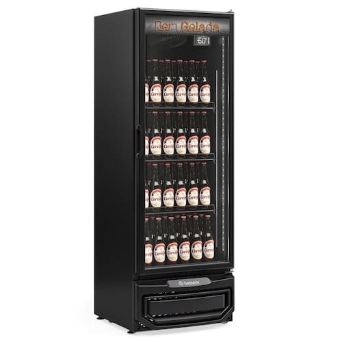 Cervejeira Vertical 410 Litros GCB40VLB Gelopar. Ideal para lanchonetes, bares, restaurantes e similares. Conservação e exposição de Cervejas e Bebidas (Água, Sucos e Refrigerantes). Temperatura regulável: -6°a +3°C (Modo Economia). Controlador eletrônico com indicador de temperatura. Refrigeração: Ar forçado com evaporador aletado. Degelo: Automático. Iluminação: 2 barras de LED internas (perimetral). Porta de vidro duplo temperado baixo emissivo (sem aquecimento). Prateleiras aramadas: 3 níveis reguláveis. Revestimento: Interno e externo em aço pré-pintado preto. Vidros sujeitos a condensação da umidade do ar. PORTAS: 1. FREQUÊNCIA: 60Hz. PLANO DE CARGA: 360 latas 350ml ou 156 garrafas 600ml. CAPACIDADE: 410 litros. CONSUMO: 4,64kWh/dia. PESO: 98kg. DIMENSÕES(CxAxP): 64,5x186x64,5cm. Equipamento certificado conforme Portaria Inmetro nº 148/2022. Cervejeira Vertical 410 Litros GCB40VLB Gelopar é na Atau.