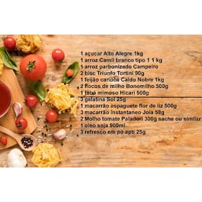 Super Cesta Básica 22 Itens produtos de Marca Completo Doação Produtos De Qualidade Cesta montada para Com produtos de qualidade e validade longa Todos os itens com validade longa, adquiridos diretamente dos fabricantes e/ou distribuidores oficiais. 1 açucar alto alegre 1kg 1 arroz camil branco tipo 1 1 kg 1 arroz parbonizado Campeiro 2 bisc triunfo tortini 90g 1 feijão carioca caldo nobre 1kg 2 flocos de milho bonomilho 500g 1 fubá mimoso hicari 500g 3 gelatina sol 25g 1 macarrão espaguete flor de liz 500g 3 macarrão instantaneo joia 58g 2 Molho tomate paladori 300g sach 1 oleo soja 900ml 3 refresco em pó apti 25g