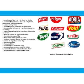 Cesta Basica Completa Produtos De Marca Doação 21 Itens Cesta Básica Completa Produtos de Primeira Qualidade 21 Itens Fotos Reais Produtos de qualidade Cesta montada para quem quer adquirir/doar produtos de alta qualidade, as fotos dos produtos da cesta básica são reais. De 8-9 KG Todos os itens com validade longa, adquirido direto dos fabricantes e/ou distribuidores oficiais. Itens 1 Arroz Branco Tipo 1 de 1 Kg Camil 1 pacote de Feijão Carioca Tipo 1 de 1 Kg Camil 1 Açúcar de 1 Kg União 1 pacote Macarrão Espaguete de 500 gramas 1 pacote de Sal Refinado de 1 kg Cisne, Lebre, Ita, ou 1 frasco Óleo de Soja 900 ml Liza, Soya, Concórdia ou 1 Molho de Tomate em lata, TetraPack ou sachê de 340 gramas Quero 1 Creme dental colgate 50g 2 Miojo nissin lamen galinha ou carne 1 Sardinha Coquero, Gomes da costa, 88, ou 1 Farinha de trigo Dona benta ou Sol 1kg 2 Biscoito recheado 1 Flocos de Milho Bonomilho, Xodomilho, Yoki e similares 2 pacote de Suco em Pó 25g Tang, Mid, Camp, ou 1 pacote de Café torrado e moído de 250 gramas Pilão 2 pacotes de Gelatina sabores diversos Royal 1 pacote de Biscoito Cream Cracker Adria Obs.: Garantimos as marcas dos produtos da Cesta salvo em caso de escassez ou falta no fabricante/fornecedor, no caso substituiremos por outro de igual qualidade. Marca: Não Informado