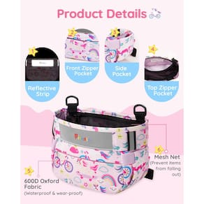 Fitense Cesta de bicicleta infantil, guidão frontal de cesta de bicicleta, cesta de bicicleta infantil de tecido bonito à prova d'água, acessórios de bicicleta infantil se encaixam na maioria dos meninos, meninas, bicicletas ou scooters infantis, fáceis de instalar - Durabilidade superior e design à prova d'água: Feito de tecido Oxford 600D premium, Fitense cesta de bicicleta infantil é feita para durar. Resiste ao desgaste diário enquanto permanece à prova d'água, garantindo que os pertences do seu filho estejam seguros, faça chuva ou faça sol. - Ajuste seguro e ajustável: com tiras de fecho aderente ajustáveis e um sistema de estabilização de três pontos, esta cesta se encaixa na maioria dos guidões de bicicleta com facilidade. A instalação é rápida, segura e sem complicações. - Design divertido e adequado para crianças: Adornado com padrões vibrantes de dinossauro ou unicórnio, esta cesta adiciona um toque divertido a cada bicicleta. Seu filho vai adorar exibi-lo! - Soluções de armazenamento inteligentes: equipado com vários compartimentos de armazenamento, incluindo 1 bolso interno com zíper, 1 bolsa externa com zíper frontal e 2 bolsas laterais de tecido, é perfeito para organizar itens essenciais como lanches, chaves ou pequenos brinquedos. - Segurança em primeiro lugar: tiras refletivas na frente e nas laterais garantem maior visibilidade para uma condução segura, mesmo com pouca luz. Além disso, funciona como um elegante suporte de acessórios para chaveiros ou pingentes.