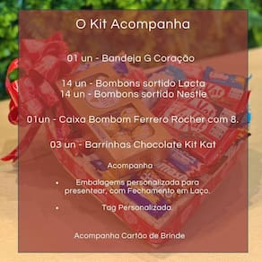 Cesta De Chocolate Formato Coração Com Lindo Laço Presente Tipo: Love Cesta de Chocolates em Formato de Coração - Surpreenda com Carinho e Sabor Essa linda cesta em formato de coração foi criada para transformar momentos especiais em lembranças doces e inesquecíveis. Com uma seleção das marcas de chocolates mais amadas - Lacta, Nestlé, Kit Kat e Ferrero Rocher - ela é perfeita para quem deseja presentear com afeto, elegância e praticidade. Indicada para datas como Dia das Mães, Dia dos Namorados, aniversários, noivados ou para demonstrar gratidão de forma afetiva. Tudo é preparado com cuidado, montado artesanalmente e pronto para ser entregue diretamente na casa de quem você ama, já com mensagem personalizada inclusa. Destaques do Produto: Um presente cheio de afeto: a cesta em formato de coração encanta pela aparência e pelo sabor Praticidade para quem presenteia: entrega direta com mensagem personalizada enviada por você Embalagem com laço decorativo, pensada para emocionar desde o primeiro olhar Ideal para surpreender em ocasiões românticas, familiares ou corporativas Montagem artesanal, com chocolates frescos das marcas mais queridas Conteúdo da cesta: 14 bombons Lacta 14 bombons Nestlé 3 unidades de Kit Kat 1 caixa de Ferrero Rocher Embalagem com laço decorativo Cartão com mensagem personalizada mensagem enviada após a compra Cesta de chocolate presente, cesta em formato de coração, presente dia das mães, presente dia dos namorados, presente romântico com chocolate, cesta com ferrero rocher, kit chocolate lacta nestlé, presente com mensagem personalizada, presente feminino criativo, cesta de bombom com laço, presente de aniversário, presente afetivo com entrega, cesta de chocolates , mimo doce para surpreender, presente pronto para envio