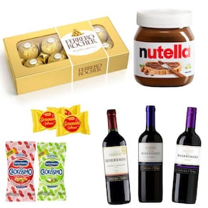 Cesta de Presente Luxo com Urso, Chocolates, Bombons e Vinho