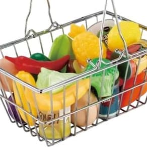 Uma pequena cesta de compras de aço inóxidavel, com vários alimentos de brinquedo, como frutas e legumes, está posicionada no centro da imagem.