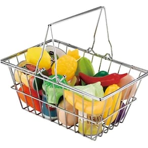 A imagem parece ser uma fotografia de uma cesta de compras de brinquedo. A imagem é composta por uma cesta de aço com alça, contendo diferentes frutas e vegetais de brinquedo em cores vibrantes. A iluminação é uniforme e clara, sem sombras proeminentes. O fundo é branco, destacando a cesta. O estilo da imagem é simples e direto, focado na apresentação dos itens na cesta.