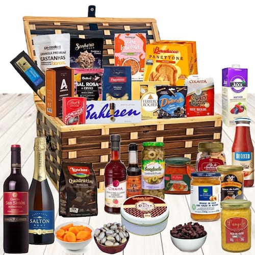 Vinho espanhol castillo de san simon monastrel 750ml Espumante brut salton 750ml Panetone bauducco frutas 400g Bombom chocolate suiço lindt lindor ao leite 37g Bombom ferrero rocher 50g 4 bombons Waffer loacker quadratini double chocolate 125g Pipoca artesanal cookies and cream senhora 100g Biscoito alemão bahlsen waffeletten dark 100g Granola castanhas germinadas com banana uncooked 250g Suco funcional antiox zero adição açucares juxx 1l Goiabada cascão cremosa tia carla lata 500g Pêssego em calda zero são lourenço 350g Bala de goma de alcaçuz zero dietorelle 70g Doce de leite tradicional portão do cambuí 410g Fio de ovos d'angelo 400g Bruschetta la pastina pimentão com jalapeo 280g Tortilla chips belive sal rosa e ervas 50g Azeitona bonduelle verde fatiada 320g Nhoque de batata paganini 500g Molho inglês lea & perrins 150ml Vinagre de framboesa italiano colavita 500ml Café premium torrado e moído a vácuo america 500g Macarrão ruote tricolori colavita grano duro 500g Passata di pomodoro italiana de cecco 700g Sopa low carb de lentilha rosa holysoup 160g Mix nuts de amêndoas com cranberry ws naturais 150g Pistache americano torrado e salgado cellena 200g Damasco turco cellena 200g Uva passa preta argentina cellena 150g