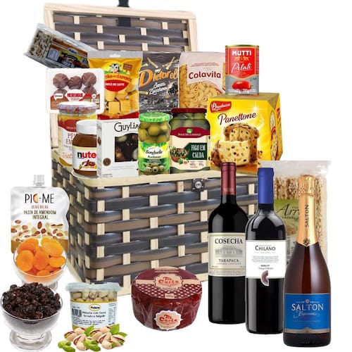 Cesta de Natal VIENA com 21 itens Selecionados Apresentamos a você a deslumbrante Cesta de Natal Viena Surpreenda alguém especial com esta cesta incrível, repleta de 21 itens selecionadíssimos, nacionais e importados, cuidadosamente embalados com todo o carinho e dedicação. 1 Vinho Chileno TARAPACA Cosecha Cabernet 750ml1 Vinho Chileno CHILANO Merlot 750ml1 Espumante Brut Salton 750ml1 Panetone BAUDUCCO Frutas 500g1 PIC-ME Amendoim Integral 200g1 Pasta de Avelã NUTELLA 350g1 Pêssego em Calda Diet São Lourenço 350g1 Figo em Calda São Lourenço 450g1 Goiabada Cascão TIA CARLA 400g1 Doce de Leite Tradicional Portão do Cambui 200g1 Bala Italiana De Goma De Alcaçuz Dietorelle 70g1 Merengue com Chocolate MELARÉ 100g1 Mandolate Cellena 160g1 Pistache Americano Torrado e Salgado CELLENA 200g1 Damasco Turco Cellena 200g1 Macarrão Gomiti COLAVITA Grano Duro 500g1 Tomate Pelado MUTTI Lata 400g1 Azeitona BONDUELLE Verde com Caroço 320g1 Uva Passa Preta FLORA s/ semente FLORA 250g1 Flocos de Arroz Caramelizado FIBRASMIL 100g Completa e Elegante Acompanhando todos esses produtos deliciosos, você receberá uma cesta de vime sintético, tamanho 50x30x21, perfeita para adicionar um toque de sofisticação à sua experiência natalina. Entregamos em Todo BrasilNão importa onde você esteja, nossa cesta será entregue diretamente no endereço que você escolher. Surpreenda alguém mesmo à distância Inclua um Cartão PersonalizadoSe você deseja enviar uma mensagem especial junto com a cesta, basta nos enviar o texto através do campo de mensagens, e nós providenciaremos um lindo cartão personalizado. Faça deste Natal um momento memorável com a Cesta de Natal Viena