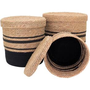 Cesta Fibra Preto 3pç Com Tampa O jogo de cestas é composto por 3 peças e cada qual com um tamanho específico: Grande Diâmetro da boca: 38cm e altura: 38cm Média Diâmetro da boca: 33cm e altura: 35cm Pequena Diâmetro da boca: 28cm e altura: 32cm A sua matéria prima é a fibra vegetal (typha angustifolia linn) e a algodão. Elas possuem um toque rústico, são leves, versáteis e arrojadas. Excelentes para decorar e organizar todo tipo de ambiente. Não lavar, molhar e armazenar em lugar seco. PALAVRAS PARA OTIMIZAÇÃO DE BUSCAS: