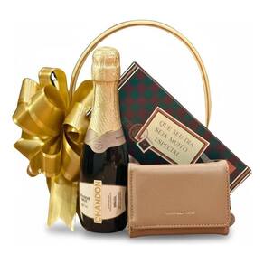Cesta Presente Chandon Baby + Chocolate + Carteira Feminina Cesta Chandon Baby com Chocolate e Carteira Feminina - presente completo e elegante Surpreenda com um presente pronto para entregar. A cesta Decorally Home Decor combina Chandon Baby 187 ml, chocolate premium e uma carteira feminina cores , tudo em uma cesta com alça e acabamento dourado. Vai embalada para presente com celofane, laço caprichado e tag para mensagem - perfeita para aniversários, fim de ano, clientes, colaboradoras e amigos-secretos. Conteúdo da Cesta 1 Chandon Baby 187 ml 1 Chocolate marca pode variar: seleção premium 1 Carteira Feminina cores : preto, marrom, nude, off-white ou ouro velho 1 Cesta com alça aprox. 20 13 cm Embalagem para presente com laço + tag para recado As cores da carteira podem ser escolhidas Sim. Envie uma mensagem após a compra indicando a cor desejada. O envio é sujeito à disponibilidade. O chocolate e a embalagem são iguais às fotos Mantemos o padrão de qualidade, mas marcas/estampas podem variar conforme disponibilidade. Vai pronto para presentear Sim. Acompanha celofane, laço e tag. Enviamos dentro de caixa para proteção. Qual o tamanho da cesta Aproximadamente 20 13 cm medida da base, pode variar levemente . Existe cartão personalizado Incluímos tag para mensagem. Cartão maior pode ser adicionado mediante consulta. Há restrição de venda Sim. Bebida alcoólica: venda proibida para menores de 18 anos. Consumo responsável. Marca: Não Informado