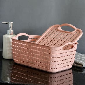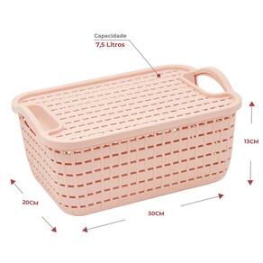 Cesto Caixa Organizadora com tampa Multiuso 7,5L COR: ROSA Organize-se com esses lindos cestos, construído em material resistentes eles são uma excelente escolha para organizar mesas, armários, closet e guarda-roupas, disponíveis em 4 diferentes opções de cores branco, cinza, rosa e terracota , possuem também tampa de fácil encaixe e alças que facilitam no manuseio.