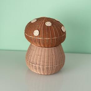 Características: - Dimensões Ideais: Com medidas de 28 cm de altura e diâmetro, é perfeito para espaços pequenos, mas com capacidade generosa. - Material Resistente: Feito de ferro e palha de milho, combina durabilidade e leveza, garantindo longa vida útil. - Corda de Papel: A alça em corda de papel proporciona fácil transporte e um toque rústico, combinando com qualquer decoração. - Tampa Protetora: Mantém o conteúdo protegido da poeira e dá um visual organizado, sem abrir mão da estética. - Design Lúdico: O formato de cogumelo traz um charme especial, transformando a organização em um elemento decorativo.
