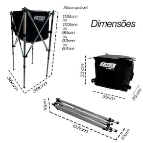 O Cesto de Bolas Beach Tennis Zaka é ideal para uso em quadras esportivas, areia e ginásio. Tem seu principal diferencial na altura com 5 posições diferentes. Fabricado em alumínio de alta resistência e que não enferruja, tecido resistente, com tampa e fechamento com zíper. Atende público exigente, com alto padrão de qualidade.