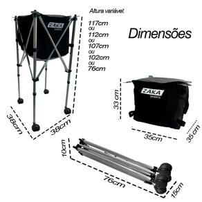 Descrição: O Cesto de Bolas Tennis/Padel Zaka é ideal para uso em quadras esportivas, areia e ginásio. Tem seu principal diferencial na altura com 5 posições diferentes. Fabricado em alumínio de alta resistência e que não enferruja, tecido resistente, com tampa e fechamento com zíper, rodinhas que deslizam leves e com facilidade. Atende público exigente, com alto padrão de qualidade. Todos os produtos são revisados e testados. Cesto de Bolas Tennis/Padel Zaka é muito resistente e prático de utilizar. Utilizamos os melhores componentes e insumos do mercado. O Cesto de Bolas Tennis/Padel Zaka tem como diferencial: - Mais resistente; - Tubos em alumínio que não enferruja; - Bolsa Removível; - Tecido de alta resistência; - Rodas maiores, que deslizam com facilidade; - Sanfonado; - 05 posições de regulagem de altura; - Desmontado otimiza espaço quando não está em uso. - Com uma tampa de tecido aerado e fechamento com zíper; - Os objetos que ambientam as imagens, não acompanham o produto. - Atenção: As cores das imagens podem sofrer alterações devido a luminosidade, configurações do monitor e até mesmo a percepção do usuário.