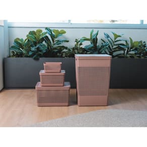A linha de Cestos Grid foi desenvolvida com um mix perfeito entre conforto, design e funcionalidade. Os cestos possuem diversos tamanhos, são empilháveis e versáteis. São diversas opções com cores neutras e acabamento fosco, que combinam com qualquer ambiente. Podem ser utilizados em closets, cozinhas, lavanderias ou até mesmo na sala de estar para decorar. Além de possuir tampa em bambu que traz um toque a mais de sofisticação e elegância para qualquer ambiente da sua casa. Os Cestos Grid são perfeitos para aliar organização e decoração na sua casa.