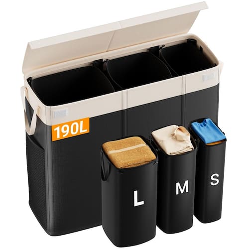 - Cesto de roupa extra grande com 3 seções SML-etiqueta para categorizar facilmente: Este cesto de roupa extra grande de 190 L com tampa (82 cm C x 30 cm L x 70 cm A) pode facilmente armazenar roupas de uma semana para toda a família, reduzindo muito o número de idas à lavanderia. Compartimentos com etiqueta SML simplificam a classificação por tamanho, cor ou tipo de tecido. 3 compartimentos diferentes facilitam a categorização da roupa por membro da família ou tipo de roupa, tornando-a perfeita para casais ou famílias.