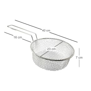 Com uma altura de 7cm, comprimento total de 40cm e comprimento do cabo de 16cm, o Cesto Fritura para Frigideira Redondo Peneira Friturama 23Cm possui uma largura de 23cm, proporcionando espaço suficiente para fritar uma quantidade maior de alimentos de uma só vez.