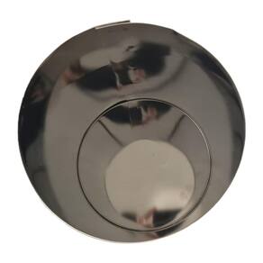 A lixeira possui tampa e corpo em aço inox polido e espelhado