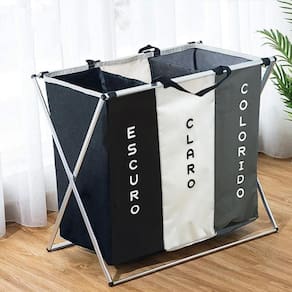 Características gerais: Classificação eficiente e simples das roupas; Cores dos cestos: preto roupas escuras , branco roupas claras e cinza roupas coloridas ; Cesto único com três divisórias; Alça de transporte; Design dobrável em forma de X, proporcionando estabilidade e facilidade de manuseio; Tecido oxford lavável e durável; Estrutura de tubos de alumínio resistente; Capacidade total de 15 kg de roupas.