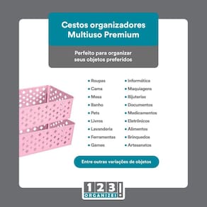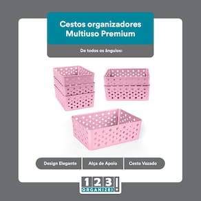 Com o Kit 2 Cesto Multiuso Organizador Premium Rosa 123Organizei, você pode organizar desde utensílios de cozinha, produtos de beleza, brinquedos, materiais de escritório, até bijuterias e acessórios. Sua versatilidade permite que você adapte os cestos de acordo com a sua necessidade.