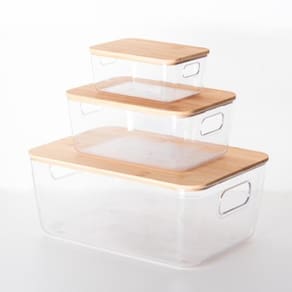 Cesto Organizador com Tampa de Bambu Idealle Eco 13 x 9,4 x 5,8 cm Descrição:A Caixa Organizadora com Tampa de Bambu Cristal Idealle Eco Paramount combina design moderno e natural, unindo um corpo de plástico resistente com uma tampa em bambu elegante. Além de facilitar a organização de acessórios, produtos de higiene, toalhas, brinquedos, sapatos, material de trabalho, produtos de limpeza e roupas, essa caixa também adiciona charme e estilo a qualquer ambiente da casa. Leve e prática, possui alças que facilitam o transporte, ideal para uso em quartos, salas, banheiros, escritórios e muito mais. Descrição Técnica:Produto Caixa Organizadora com Tampa de BambuMarca ParamountMaterial Corpo em Poliestireno PS e tampa em Madeira (Bambu)Cor Transparente com tampa naturalDimensões 13 x 9,4 x 5,8 cm (Comprimento x Largura x Altura)Conteúdo 01 Caixa organizadora e 01 tampaCuidados Lavar com água e esponja macia usando detergente neutro, evitar palha de aço, enxugar imediatamente após lavagem