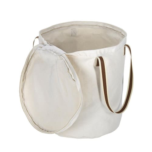 1. Alças para transporte.2. Tampa com fecho.3. Lona 100% algodão na cor natural.4. Não é autosustentável.5. Pode ser guardado dobrado.6. Não é impermeável.
