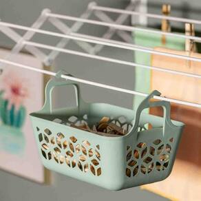 Cesto para prendedores de roupa com gancho. O cesto para prendedores de roupa de plástico é um acessório muito útil para quem busca organização e praticidade durante o processo de lavagem e secagem de roupas. O Cesto é feito de plástico resistente e flexível, tem um tamanho ideal para armazenar e transportar prendedores de roupa. Ele possui 2 Ganchos para pendurar no varal, ele é ideal para quem precisa de um lugar organizado para armazenar seus prendedores de roupa e evitar que eles se espalhem pela área de lavagem ou se percam.
