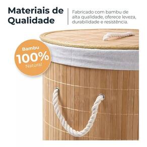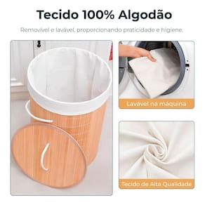 Capacidade: aproximadamente 60 litros Dimensões cm : altura 60 largura 35 comprimento 35 E para tornar tudo ainda melhor, enviaremos a você um cesto de bambu com tecido interno, alças e tampa removível.