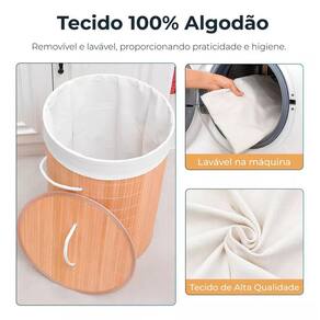 Capacidade: aproximadamente 60 litros Dimensões cm : altura 60 largura 35 comprimento 35 E para tornar tudo ainda melhor, enviaremos a você um cesto de bambu com tecido interno, alças e tampa removível.