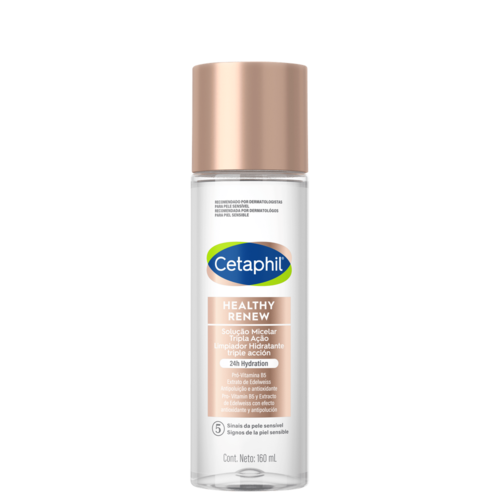 Água micelar. Cetaphil Healthy Renew Tripla Ação é uma loção de limpeza anti-aging que remove maquiagem e protetor solar, hidrata por até 24 horas após o uso e refina suavemente a textura da pele.