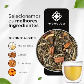 O Toronto Nights combina chá branco e chá verde com capim-limão, laranja-doce, amêndoas e delicadas notas de canela. O resultado é uma infusão aromática e encorpada, com equilíbrio entre o cítrico e o amendoado.