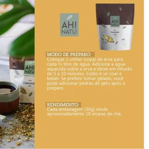 Chá de camomila 30g flor e caule linha premium ah natu O chá de camomila matricaria recutita l. tem ação principal sobre a ansiedade e o nervosismo, também combatendo a insônia. Além disso, auxilia na redução das cólicas e na eliminação dos gases. ========== Planta: camomila Nome científico: matricaria recutita l. Nome popular: camomila, camomila-alemã, camomila-comum, camomila-da-alemanhã, camomila-húngara, camomila-verdadeira, camomila-vulgar, macela-nobre, margaça, matricaria Família: arastaceae Parte utilizada: flor inflorescência e caule ========== Contraindicações: não deve ser em casos de gravidez e/ou lactação. ========== Modo de preparo: coloque 1 colher sopa de erva para cada litro de água. Adicione a água aquecida sobre a erva e deixe em infusão de 5 a 10 minutos. Então é só coar e beber. Se preferir tomar gelado, você pode adicionar pedras de gelo após o preparo. ========== Nossos ingredientes passam por um processo de esterilização que garante a segurança e a pureza dos produtos. além disso, auxilia na redução das cólicas e na eliminação dos gases. ========== Rendimento: cada embalagem 30g rende aproximadamente 10 xícaras de chá.