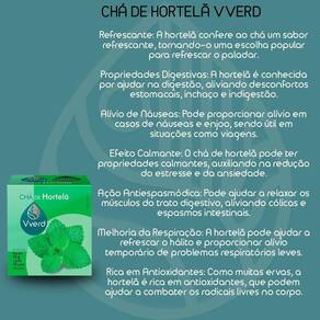 Digestivo: A hortelã é conhecida por suas propriedades digestivas, ajudando a aliviar azia, náuseas, indigestão e gases. O chá é ideal para ser consumido após as refeições, promovendo uma digestão mais leve e confortável. Refrescante: O sabor mentolado da hortelã proporciona uma sensação refrescante e revigorante, ideal para se refrescar em dias quentes.