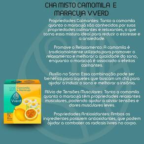 O Chá Misto Camomila e Maracujá Vverd é uma combinação perfeita entre a suavidade da camomila e o sabor tropical do maracujá, proporcionando uma experiência sensorial única e relaxante.
