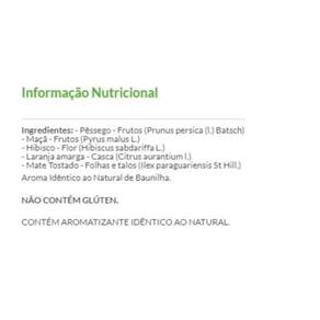 Maçã - Frutos (Pyrus malus L.); Pêssego - Frutos (Prunus persica (L.) Batsch); Mate Tostado - Folhas e talos (Ilex paraguariensis St. Hil.); Laranja-amarga - Frutos (Citrus aurantium L.); Aroma idêntico ao natural de Pêssego. NÃO CONTÉM GLÚTEN.