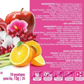 Maçã – Frutos (Pyrus malus L.); Hibisco – Flores (Hibiscus sabdariffa L.); Beterraba – Raízes (Beta vulgaris L.); Mate Tostado – Folhas e talos (llex paraguariensis St. Hill.); Laranja-Amarga – Frutos (Citrus aurantium L.); Limão - Frutos (Citrus limonium Risso); Capim-Cidreira - Folhas (Cymbopogon citratus Stapf); Chá Preto – Folhas e talos (Camellia sinensis (L.) Kuntze); Aroma artificial de cereja e aroma artificial de framboesa. NÃO CONTÉM GLÚTEN.