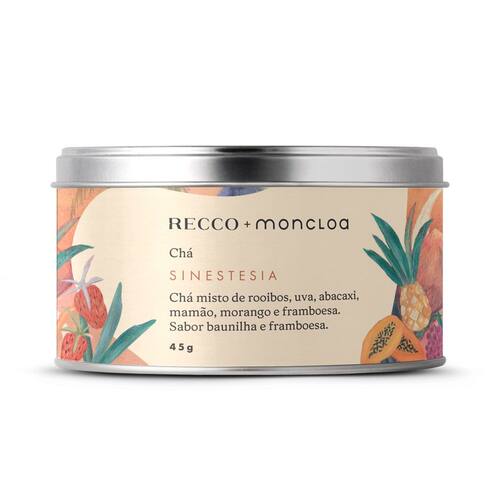O blend Sinestesia é um chá misto de rooibos, uva, abacaxi, mamão, morango e framboesa, com toque de baunilha e framboesa. Um convite para sentir a suavidade tropical, o frescor das frutas e a doçura acolhedora que acaricia o paladar.
