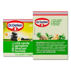 Ingredientes: Frutos de maçã Pyrus malus L. , folhas e talos de chá verde Camellia sinensis L. Kuntze , folhas de laranja-doce Citrus aurantium L. , rizomas de gengibre Zingiber officinale Roscoe , folhas de pitanga Eugenia uniflora L. , folhas e ramos de hortelã Mentha piperita L. , folhas e talos de alecrim Rosmarinus officinalis L. , entre outros. Alérgicos: Pode conter trigo, centeio, cevada e aveia. Contém glúten. Conservação: Armazenar em local seco e fresco. Validade: Vide data de validade na embalagem. Fabricante: Dr. Oetker.