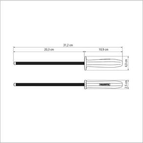 - Cabo de polipropileno.- Haste em aço Carbono SAE 1045, estriada e imantada.- indicada para a Afiação de facas em geral.- revestimento da Haste em cromo-duro que garante Maior resistência contra corrosão e deixa a superfície da Chaira mais dura que a Lâmina da faca. Ean: 7891112084643