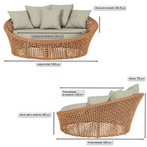 A trama artesanal em corda náutica adiciona um toque moderno e elegante, além de proporcionar flexibilidade e conforto inigualáveis. Para completar, o estofado em tecido impermeável assegura praticidade e bem-estar em qualquer ambiente, seja na área externa ou interna.