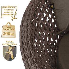 A trama artesanal em corda náutica adiciona um toque moderno e elegante, além de proporcionar flexibilidade e conforto inigualáveis. Para completar, o estofado em tecido impermeável assegura praticidade e bem-estar em qualquer ambiente, seja na área externa ou interna.