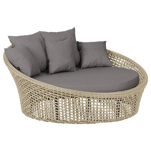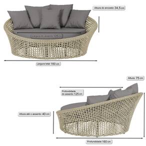 A trama artesanal em corda náutica adiciona um toque moderno e elegante, além de proporcionar flexibilidade e conforto inigualáveis. Para completar, o estofado em tecido impermeável assegura praticidade e bem-estar em qualquer ambiente, seja na área externa ou interna.
